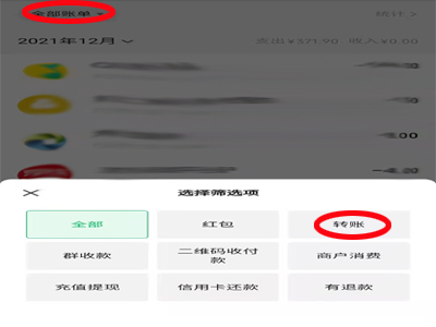 4、点击左上角的“全部账单”,在弹出的类别中选择“转账”,便可以看到转账记录。