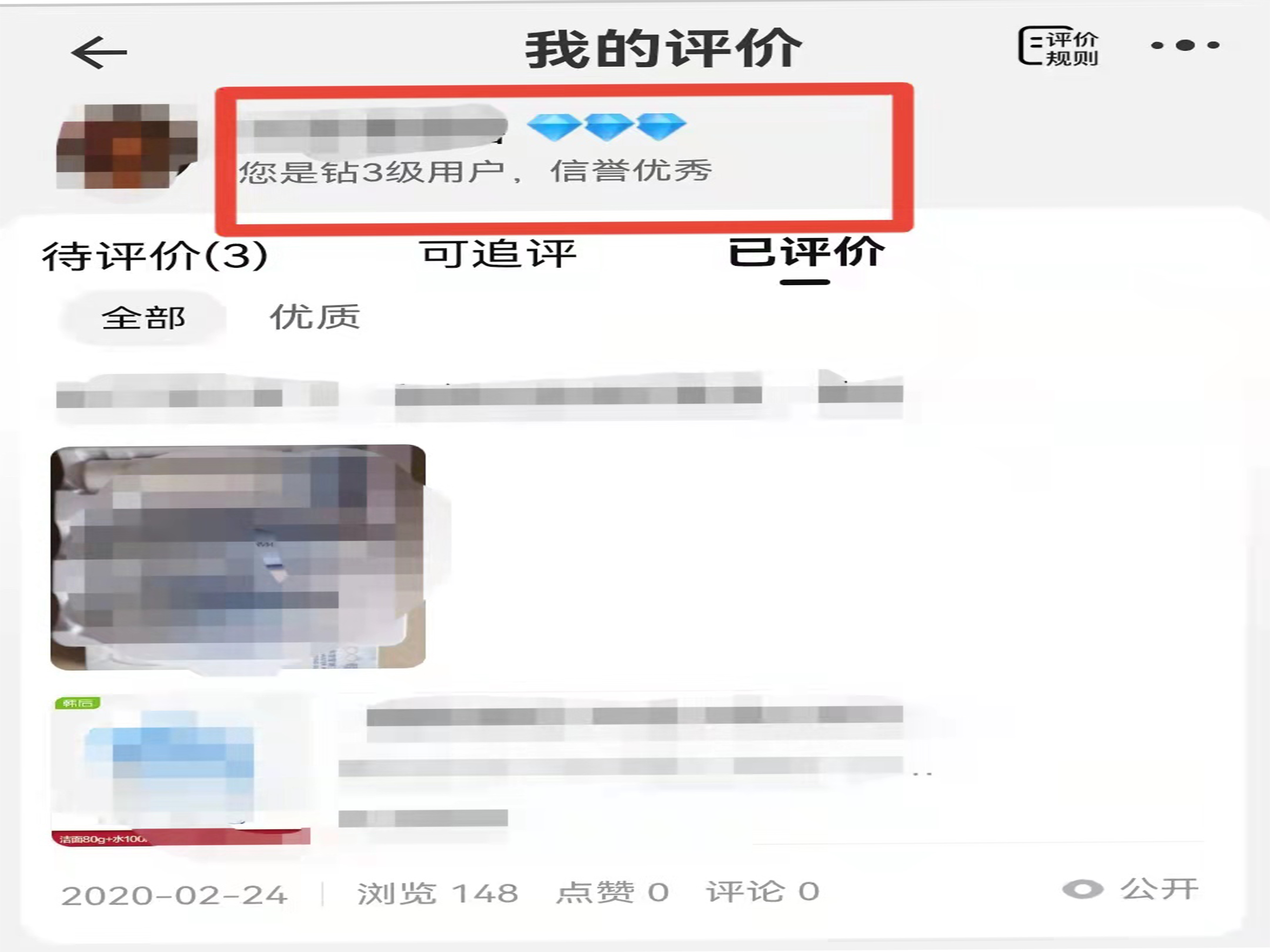 3、在我的评价页面,即可看到左上角的淘宝号后面有几颗心、钻或冠。