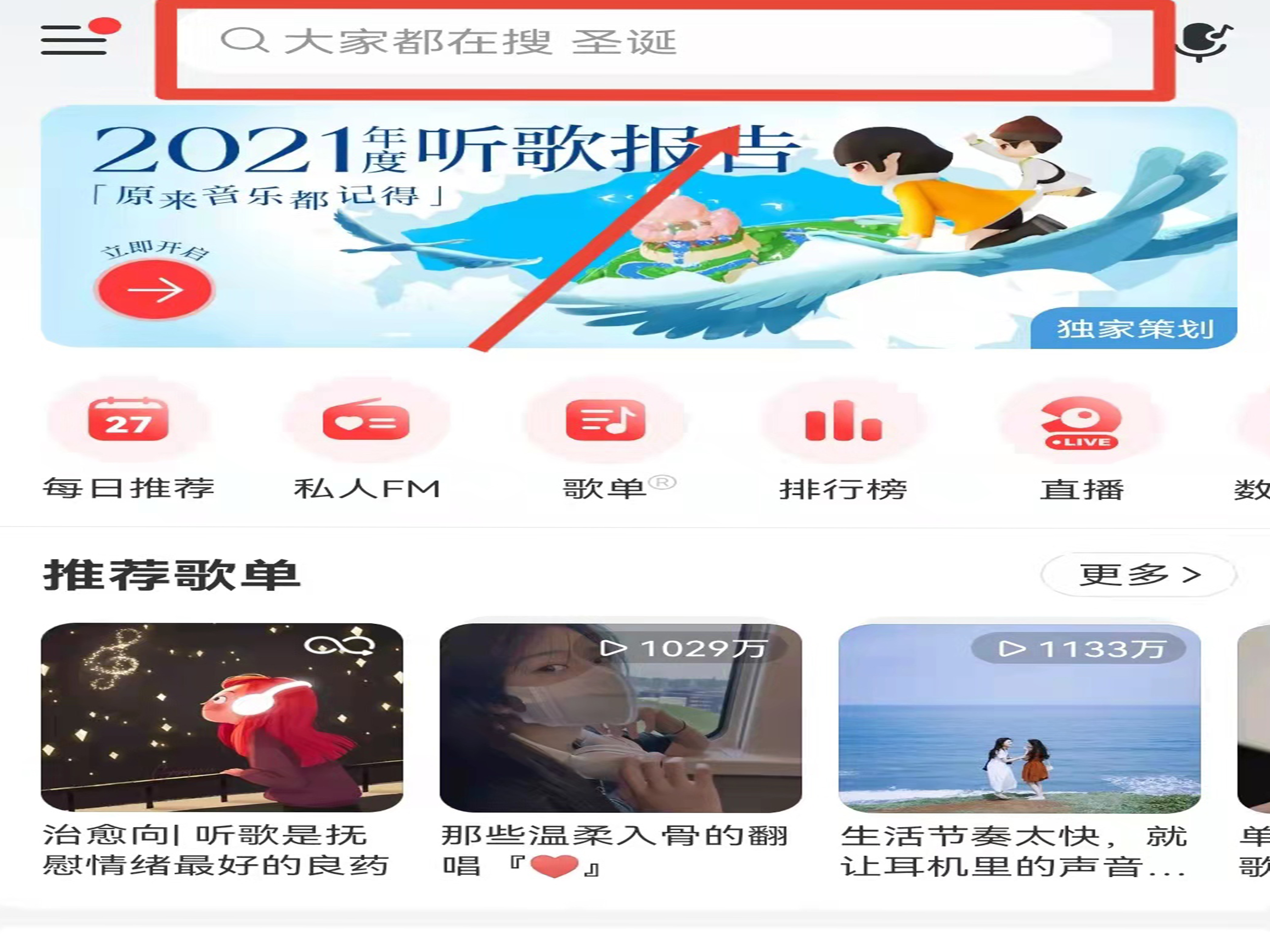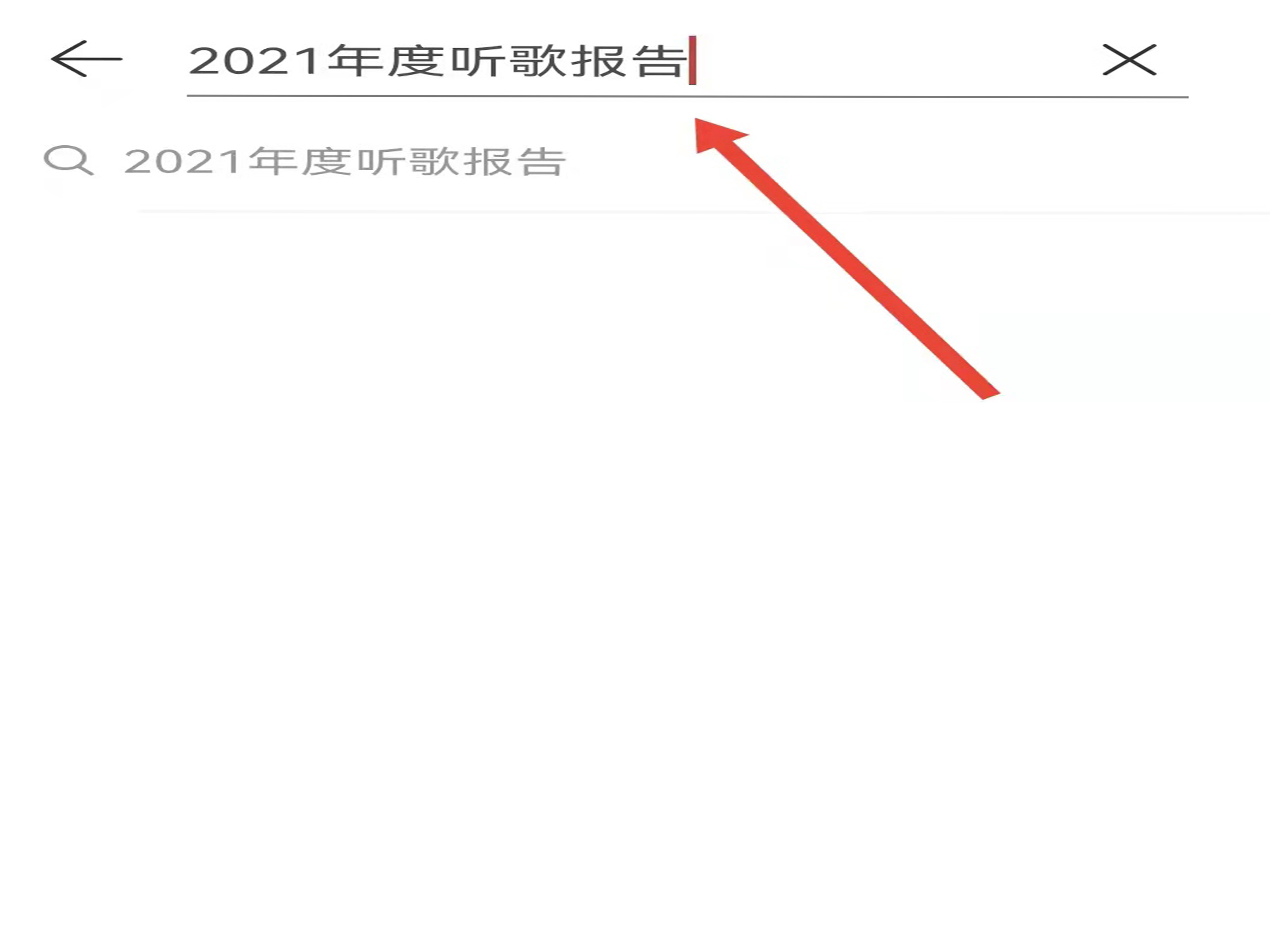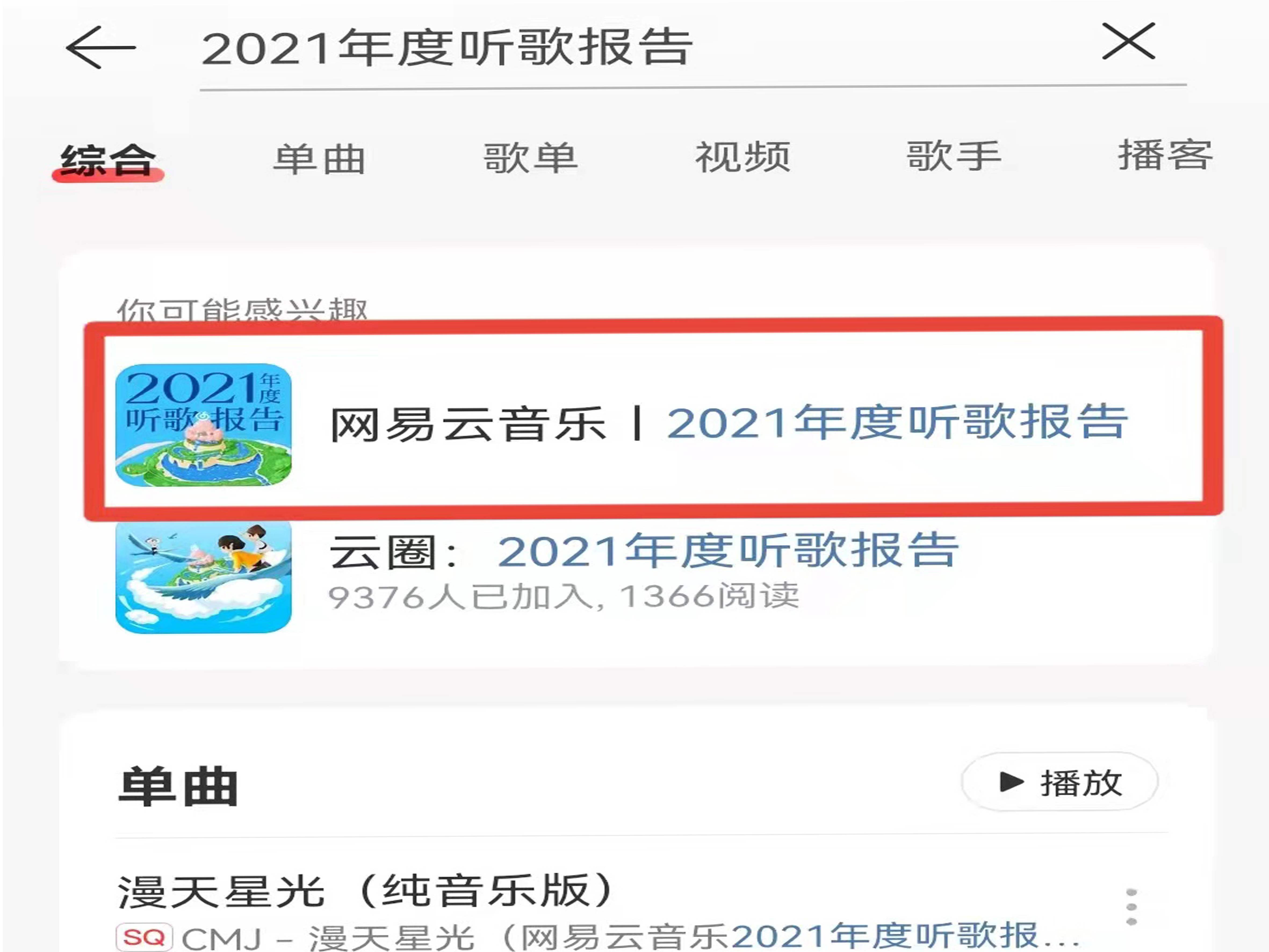 2、在搜索栏中输入“2021年度听歌报告”,点击搜索。