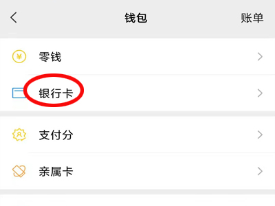 3、在钱包页面点击“银行卡”,进入银行卡页面。