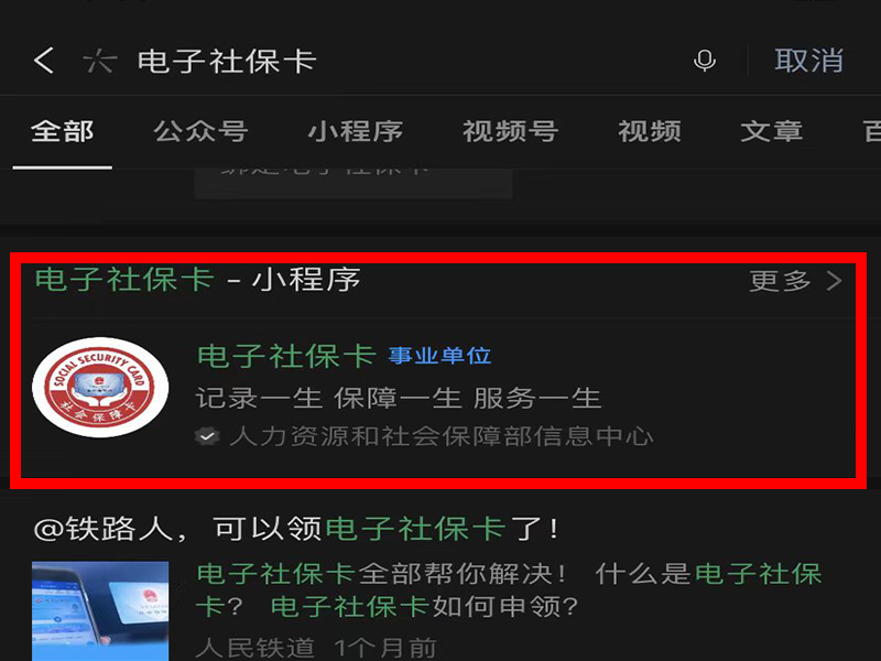 1、打开微信app,在上方的搜索栏中搜索并进入“电子社保卡”小程序。