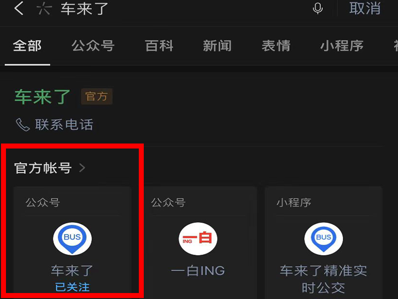 1、打开微信app,在上方的搜索栏中搜索并关注“车来了”公众号。