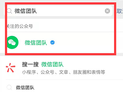 1、打开手机微信app,搜索并进入微信团队公众号。