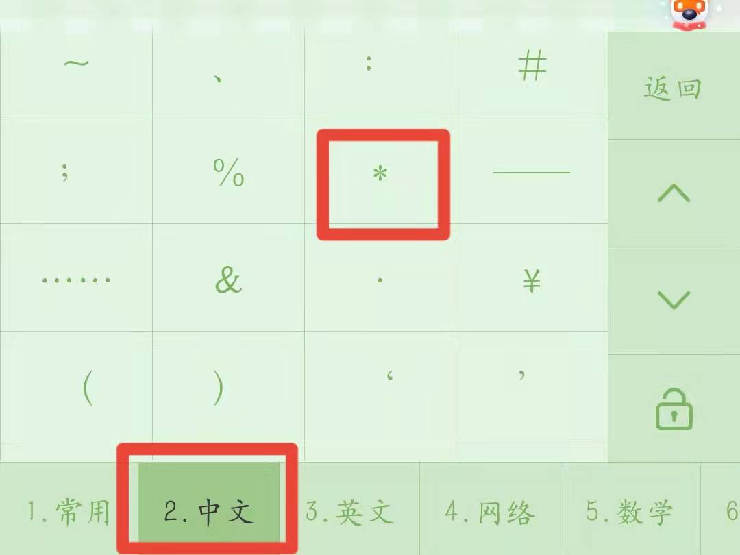 方式一、打开输入框,点击“符号”,点击“中文”,找到“*”,再点击即可。