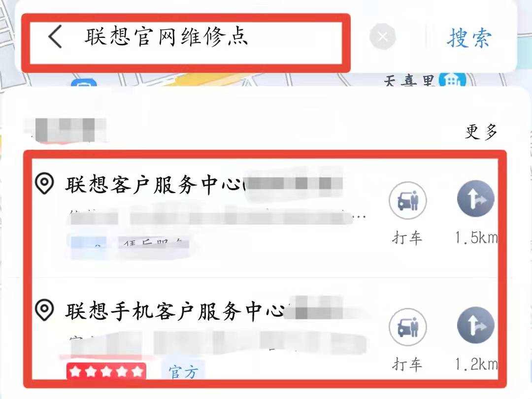 2、在搜索栏搜索“联想官网维修点”,即可看到相关地址,前提是手机的位置功能已开启。