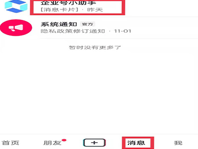1、打开抖音,切换至消息页面,搜索并点击企业号小助手。