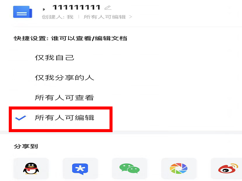 4、在“分享”界面中点击“所有人可编辑”即可。