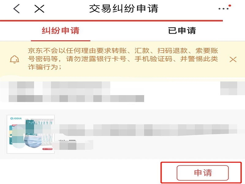 4、选择需要申请的订单,并点击“申请”,进入下一个操作页面。
