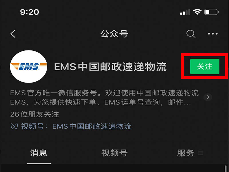 2、点击右侧绿色“关注”标识,关注邮政公众号。