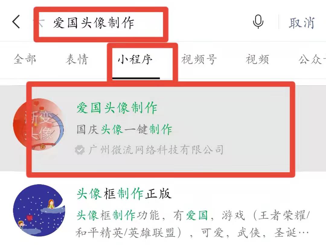 1、打开微信,搜索“爱国头像制作”,点击“爱国头像”小程序。
