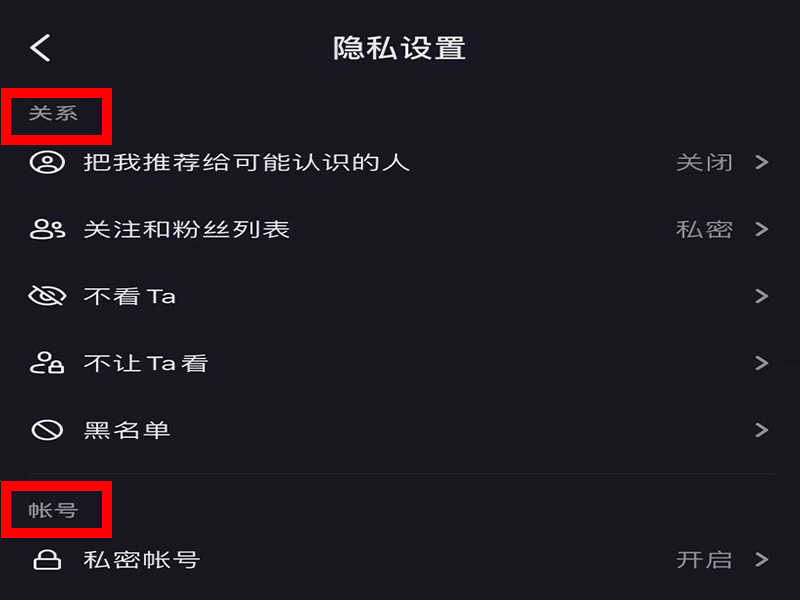 4、在“关系”或者“账号”中设置自己抖音账号不被别人看见就可以了。