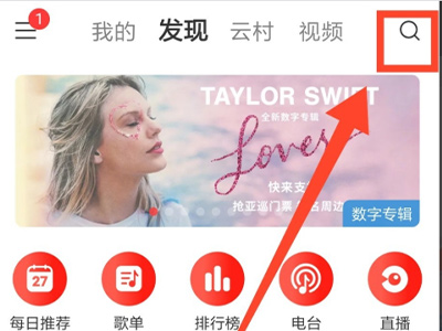 1、打开网易云音乐,切换的“发现”页面搜索音乐。