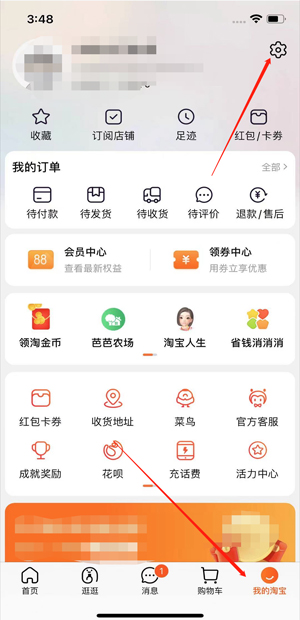 1、打开淘宝,在“我的淘宝”界面中点击右上角的设置按钮。