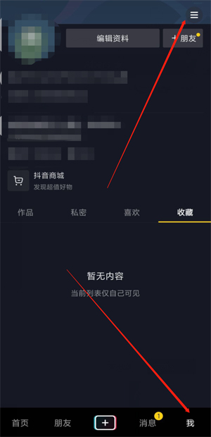 1、打开抖音,在“我”的界面中点击右上角的三横杠按钮。