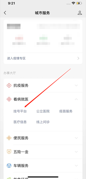 3、点击“看病就医”下的“挂号平台”。