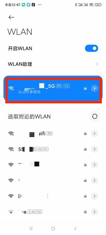 2、选择设置二维码的wifi,连接后点击分享。