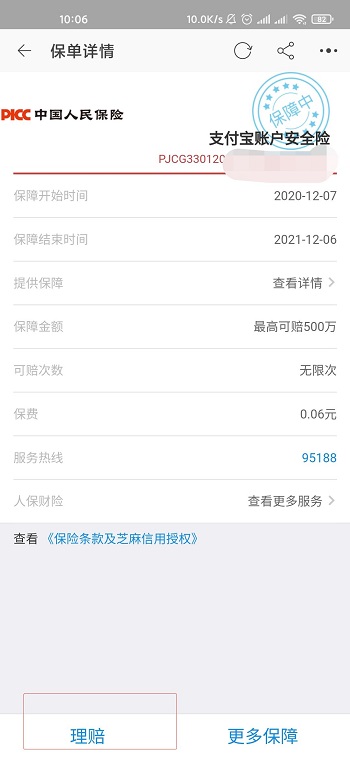 5、进入支付宝账户安全险保单,点击“理赔”。