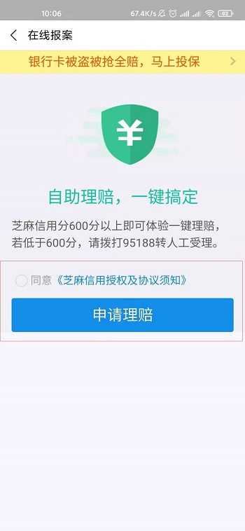 6、勾选“《同意芝麻信用授权及协议须知》”,申请理赔即可。