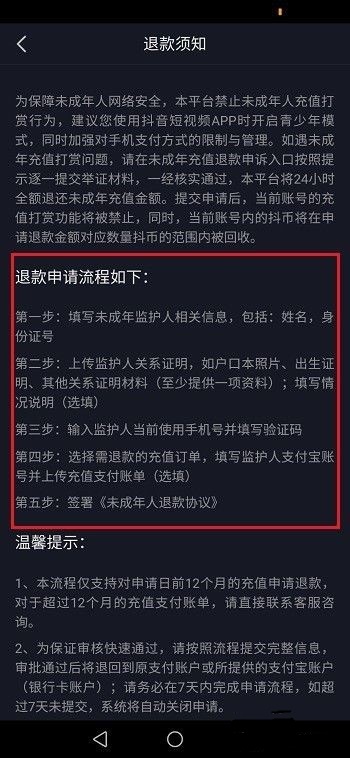 4、抖音未成年人退款申请流程:填写信息,上传监护人关系证明等材料,验证手机号,选择需要退款的订单,填写监护人支付宝账号,最后签署未成年退款协议。