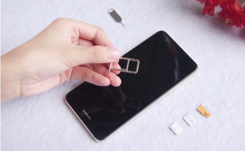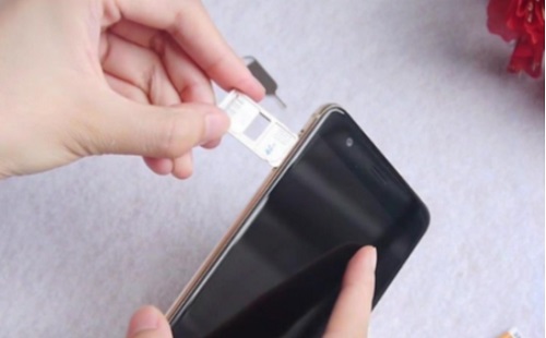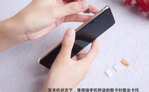 4、然后开始将卡正确放入卡托中,按如图所示,将卡托放回原卡槽即可。