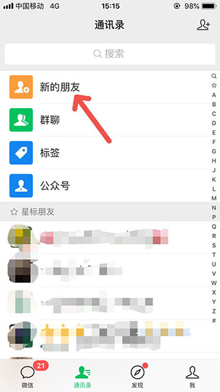2、点击最上面的“新的朋友”。如图: