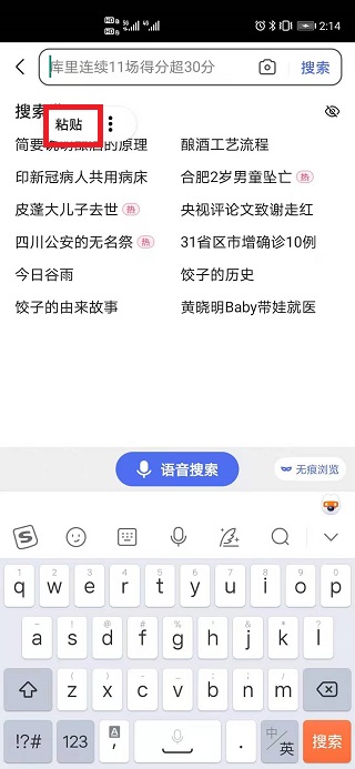 3、在手机百度里输入框里长按输入框,点击“粘贴”打开。