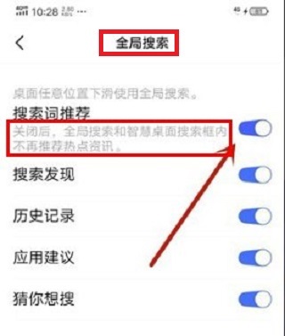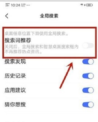 5、将“搜索词推荐”后的开关关闭。这样vivo手机就不会一直弹广告了。