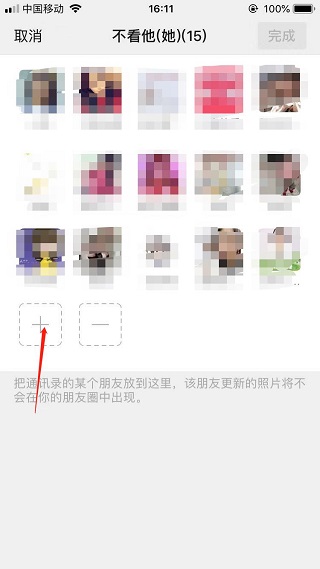 4、点击“不看他(她)”,选择“+”,添加该好友,他将不再出现在你的朋友圈。