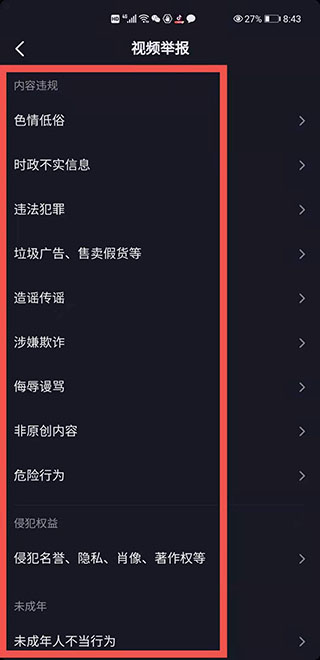 3、在举报页面,选择举报原因并进入页面填写详细信息。如图: