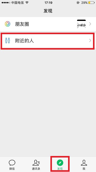 5、点击菜单栏里的“发现”就能看到“附近的人”了。