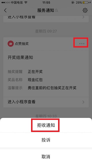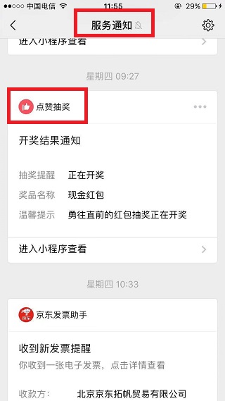 5、或者打开服务通知页面,找到小程序的消息,比如点赞抽奖小程序。