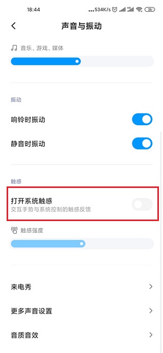3、在声音与震动设置中选择打开系统触感并将其关闭,这样就关掉了按键震动。如图: