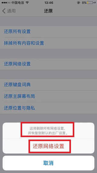 5、这时候会出现“这将删除所有网络设置……”的提示,点击下方的还原网络设置即可。