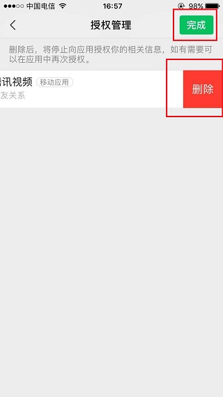 5.将绑定的第三方账号删除,最后点击完成,这样就解除了第三方账号微信绑定。
