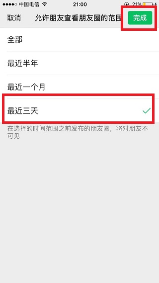 4、在新打开的页面选择最近三天,点击完成。在最近三天之前的朋友圈将对朋友不可见。
