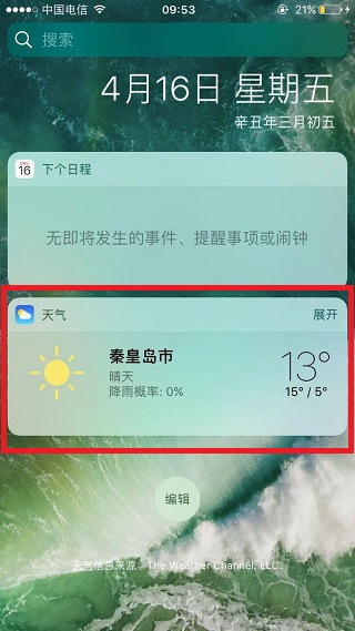 首先将苹果手机桌面滑到最左边带有“搜索栏”的页面,点击“编辑”进入“添加小组件”页面后,找到“天气”组件,点击左边的“+”号,最后点击右上角的“完成”,这样天气就显示在屏幕上了。