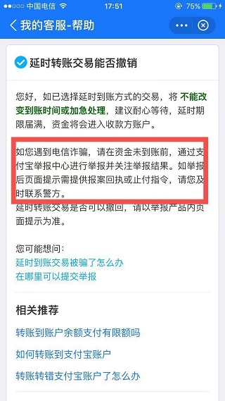 3、支付宝转账最好选择延时到账,这样的话如果遇到电信诈骗,可以在资金未到账前通过支付宝举报中心进行举报,要及时报警。