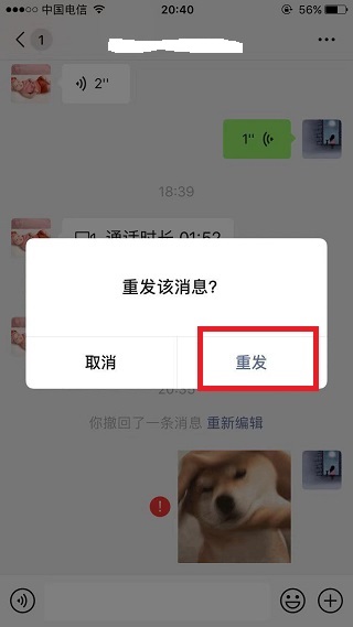 4、点击聊天记录中的红色感叹号, 在弹出的对话框中点击重发。
