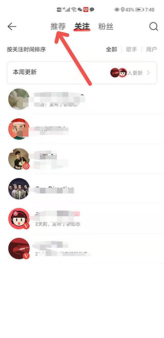5、点开"关注"后,就可以看到"推荐"。