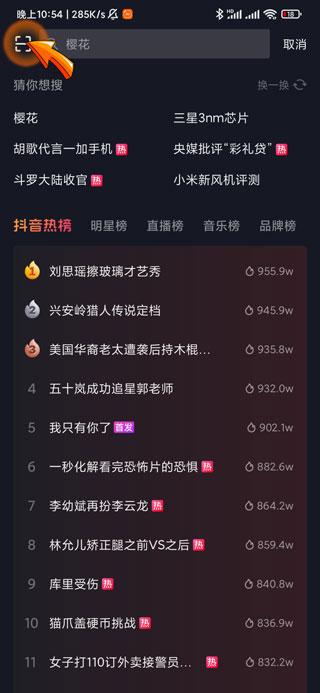 1、抖音扫码首先需要打开抖音APP,点击页面右上角“放大镜”图标。