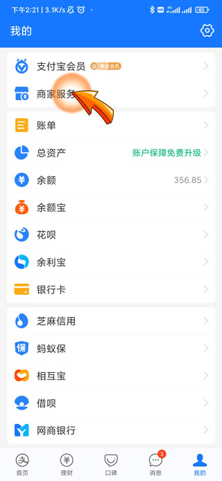 2、然后点击我的页面中的“商家服务”选项。