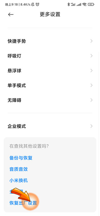 3、进入更多设置页面后,点击页面底部的“恢复出厂设置”选项。