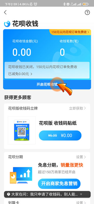 5、最后点击“开启花呗收钱”选项即可。