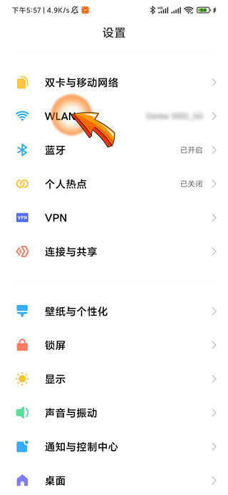 无线密码忘记了可以通过无线密码分享二维码进行查看,首先打开桌面上的“设置”图标,然后点击“WLAN”选项,选择并点击需要分享的无线密码“账号”名称,此时弹出的二维码即为无线网密码,使用手机扫描即可查看。