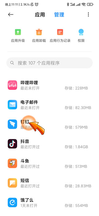 4、之后在管理中找到并点击“钉钉”选项。