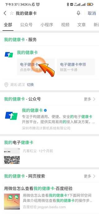 2、然后在搜索栏中输入“我的健康卡”,之后点击下方的“电子健康卡服务”选项。