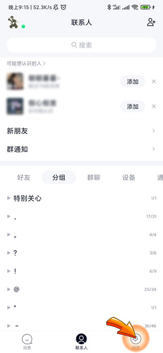 1、qq查看被挡访客需要打开QQAPP,点击页面右下角的“动态”图标。