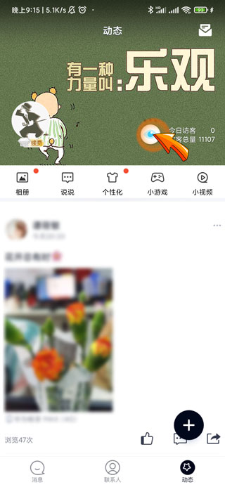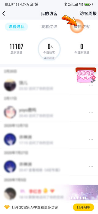 qq查看被挡访客需要打开QQAPP,点击首页右下角的“动态”图标,进入动态页面后点击头像右侧的“眼睛”图标,进入我的访客页面后,点击“被挡访客”选项即可查看空间别挡的访客。