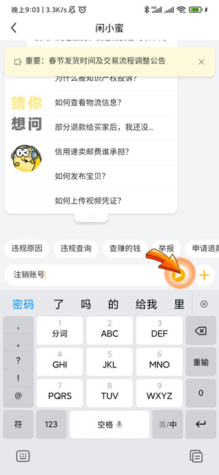 5、编辑内容“注销账号”后点击右侧的“发送”箭头图标。
