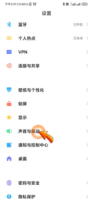 2、进入设置页面后,点击“声音与振动”选项。
